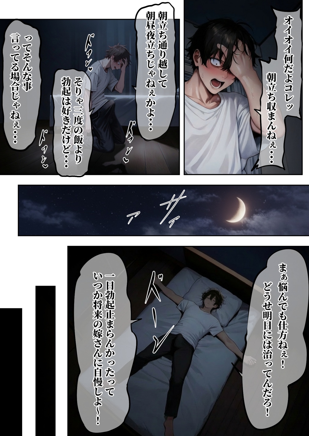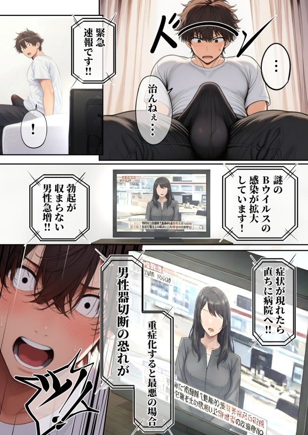 ―勃起ウイルスー カルテ1 〜理想の女とセックスするまで勃起が収まらないBウイルスに感染した童貞の診療録〜 今すぐ続きを読む ―勃起ウイルスー カルテ1 〜理想の女とセックスするまで勃起が収まらないBウイルスに感染した童貞の診療録〜 作品内容 !緊急特番です! 現在、新型の感染症、その名もBウイルスが全国的に蔓延しています。 男性にのみ発症し、その症状は・・・えっと・・・『勃起が収まらない』です・・・ 原因や治療方法もまだはっきりと分かっておりません。ワクチンの開発も数年かかるとの見込みで、政府は――― マチアプ107連敗中の30歳童貞『鈴木真人』 ありふれた日のありふれた朝の事 『なんか今日の朝立ちエグいな・・・まぁいつもの事か・・・』 ありふれた朝立ち・・・の筈だった―――。 これはBウイルスに感染した30歳童貞、鈴木真人のカルテ。 完治した患者達の共通点は『理想の女と理想の性行為をした事』 ★看護師、候補1 黒ギャル巨乳『早川 萌那』の施術記録。着衣での施術。 フェラ、パイズリ、童貞卒業騎乗位セックス ★看護師、候補2 茶髪色白巨乳『原 凛花』の施術記録。着衣での施術。 シックスナイン、アナルセックス ★看護師、候補3 『柴崎 杏奈』の施術記録。着衣、及び下着、全裸での施術。 フェラ、パイズリ、男の潮吹き、ちんぐり騎乗位、種付けプレス、キスハメ 収録内容★ 本編68ページ 文字なしバーション68ページ ※本作品はイラスト生成AIを使用して生成したキャラクター画像と一部背景、全描き文字とフキダシを作画して製作しております。 「ぱるぱるむんむん」の人気作品 童貞をバカにする女社長のSSボディ相手に大人のセックス(外出し)が出来なければクビにされる 童貞をバカにするギャルは純潔の巨根に堕ちる 童貞をバカにする幼馴染は初恋の大きさを思い出す