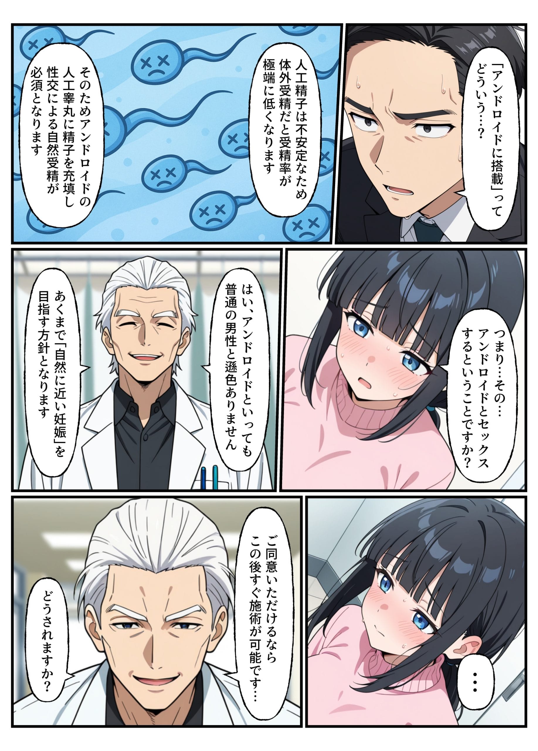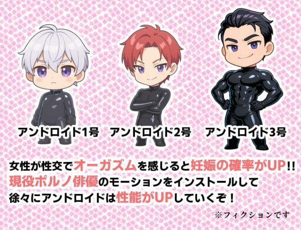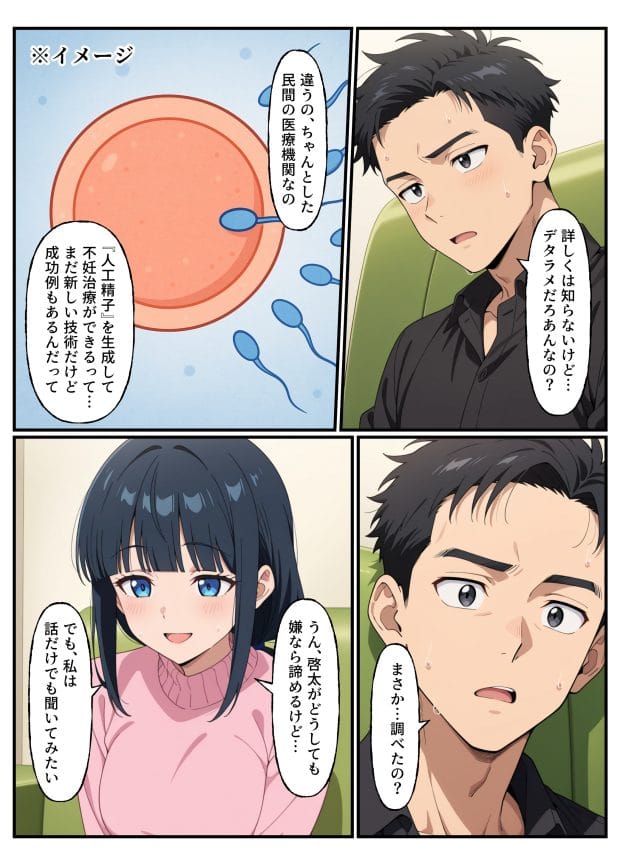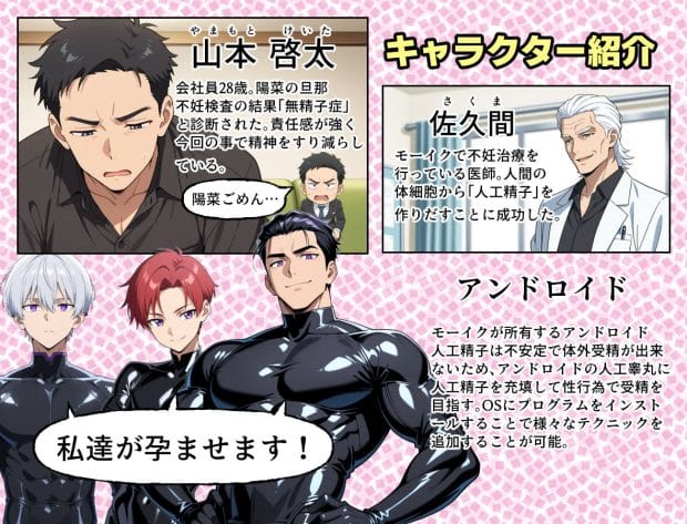 モーイクで説明された施術内容は、旦那の体細胞から作られた「人工精子」を搭載した「アンドロイド」と性行為を行うことで自然受胎を目指すというものであった。