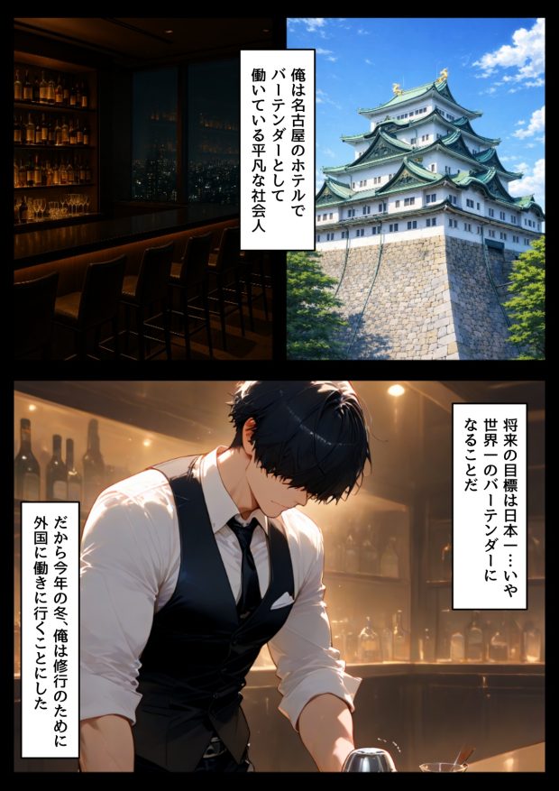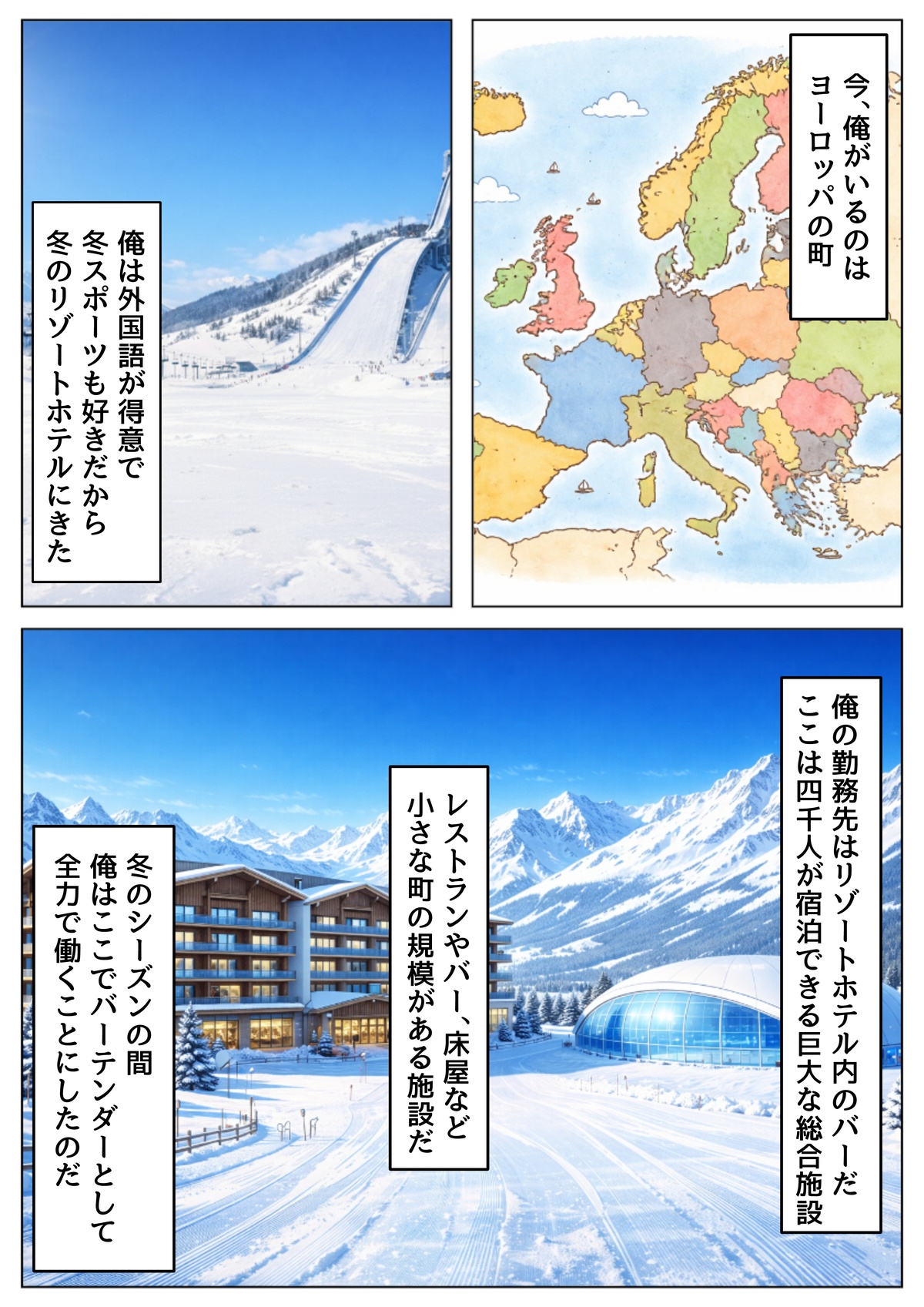 俺は平凡なバーテンダーだが、冬スポーツが好きなので、冬季間だけ海外のリゾートホテルで働くことに。