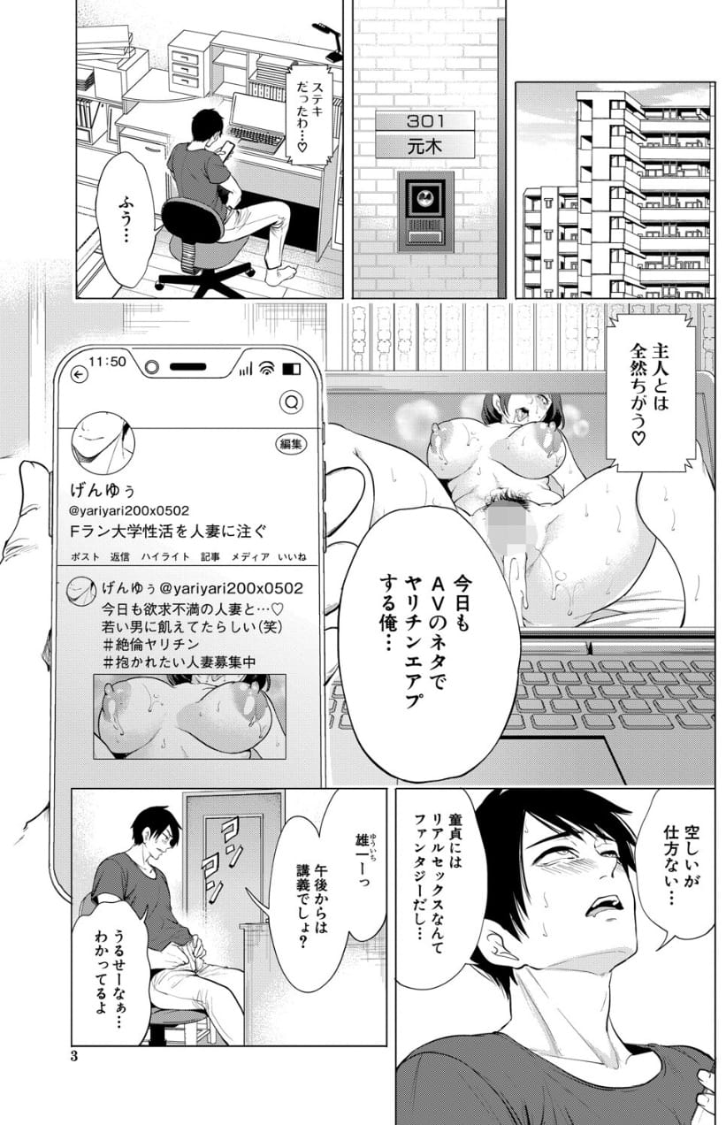 大学生の雄一は、SNSのエロアカウントで「人妻を喰い漁っているヤリチン」のフリをしているが、正真正銘の童貞だ。