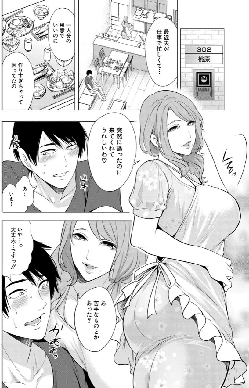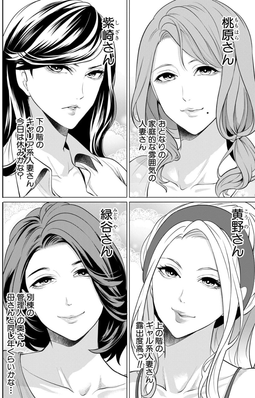 ひょんなことから住人の人妻たちに目を付けられて・・というお話。
