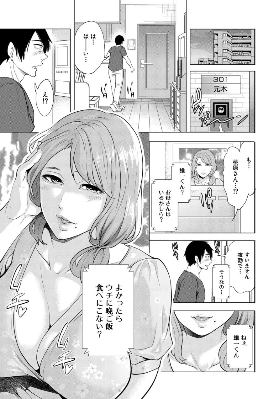 ある夜、お隣の人妻・桃原さんに呼び出され、裸エプロンで逆レ●プ、童貞を奪われてしまう!