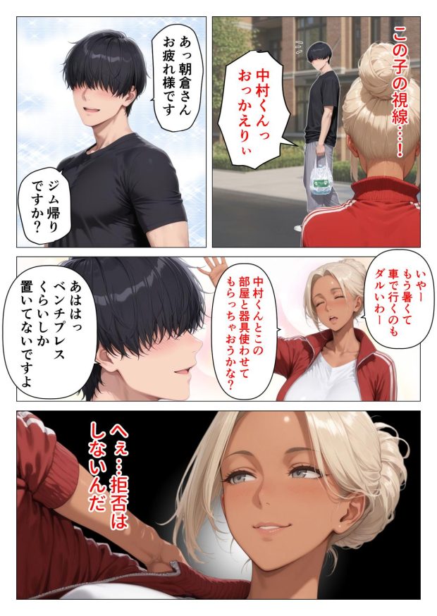 そんなある日、美巨乳黒ギャル人妻リナが「ジム器具貸して(はーと)」と部屋に突撃。